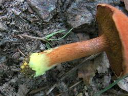 | Cap can be a deep reddish brown color and conical in shape as in this collection found along a trail in a hardwood forest. July. Bright yellow mycelium at stem base (did I need to tell you that?). |