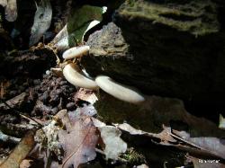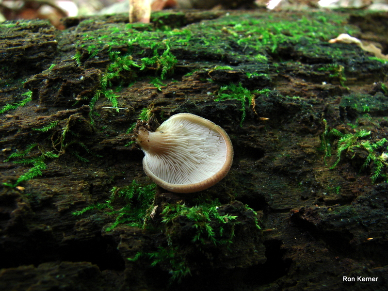 | This ho-hum Hohenbuehelia grows in a shelf-like manner from rotting hardwood logs. Cap light brown, whitish, sometimes a dingy grey. Close, off-white gills. Rubbery texture. Similar to some Crepidotus mushrooms, but Crepidotus mushrooms have a brown spore print. Spore print white with Hohenbuehelia. |