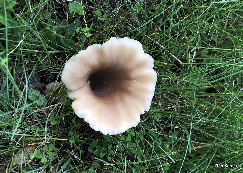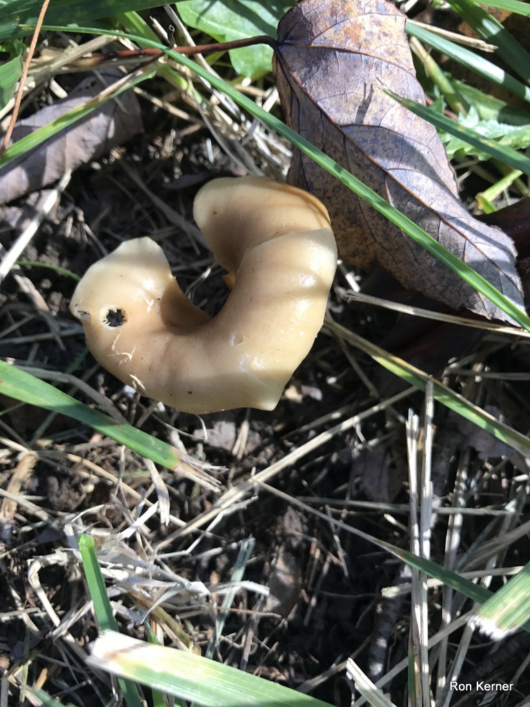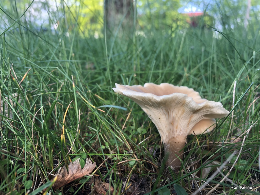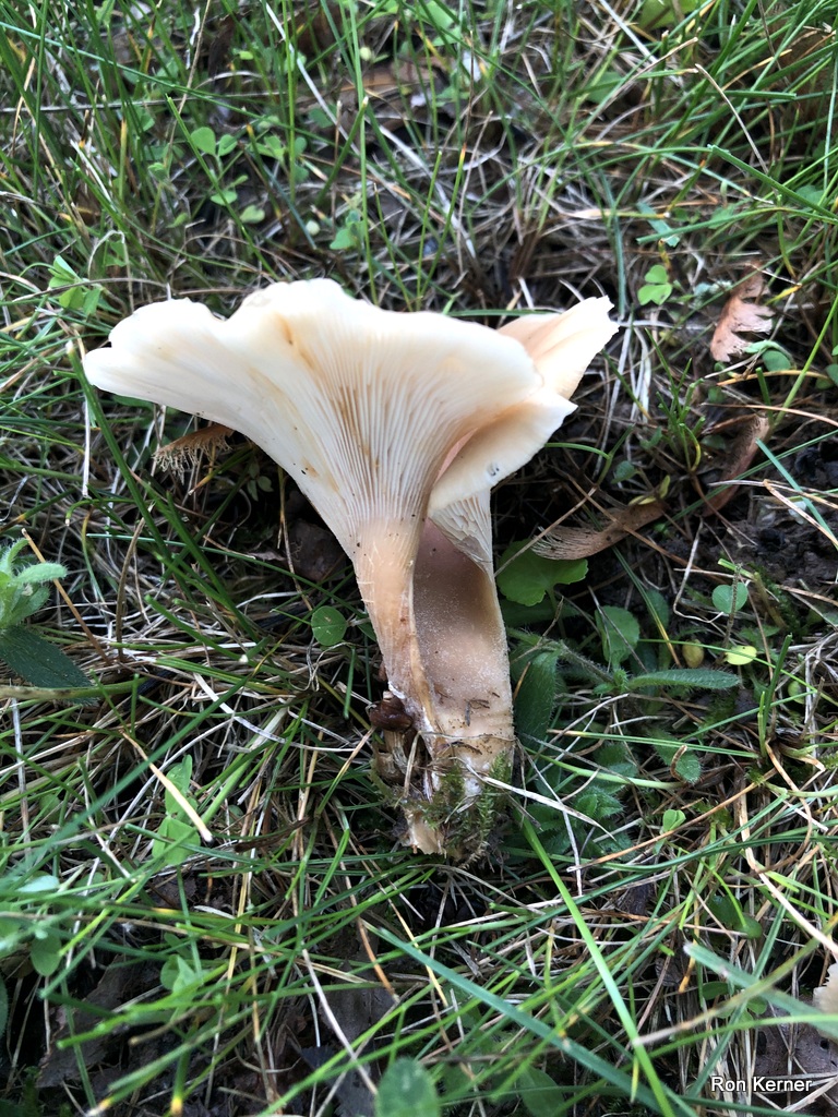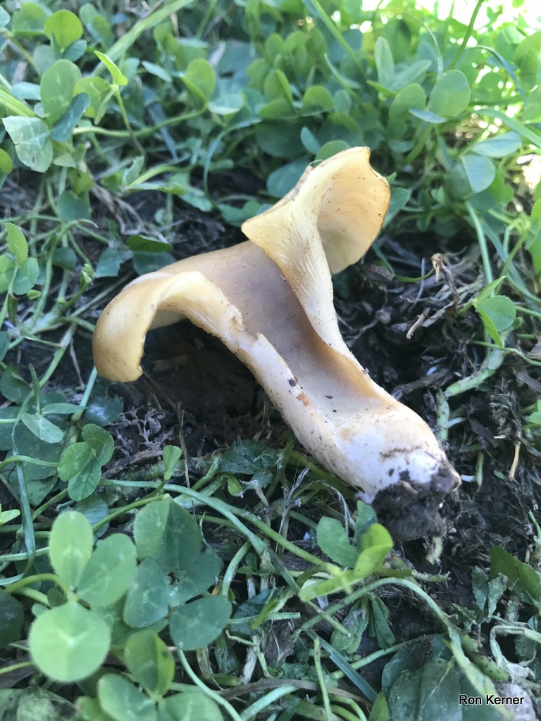 | This prime example of Hohenbuehelia petaloides was growing alone in an unkept lawn that had an accumalation of leaves and woody debris mixed with the thatch layer. Folds around itself and creates a funnel-like slot, similar to a shoehorn. Crowded gills run completely down the stem. Spore print white. |