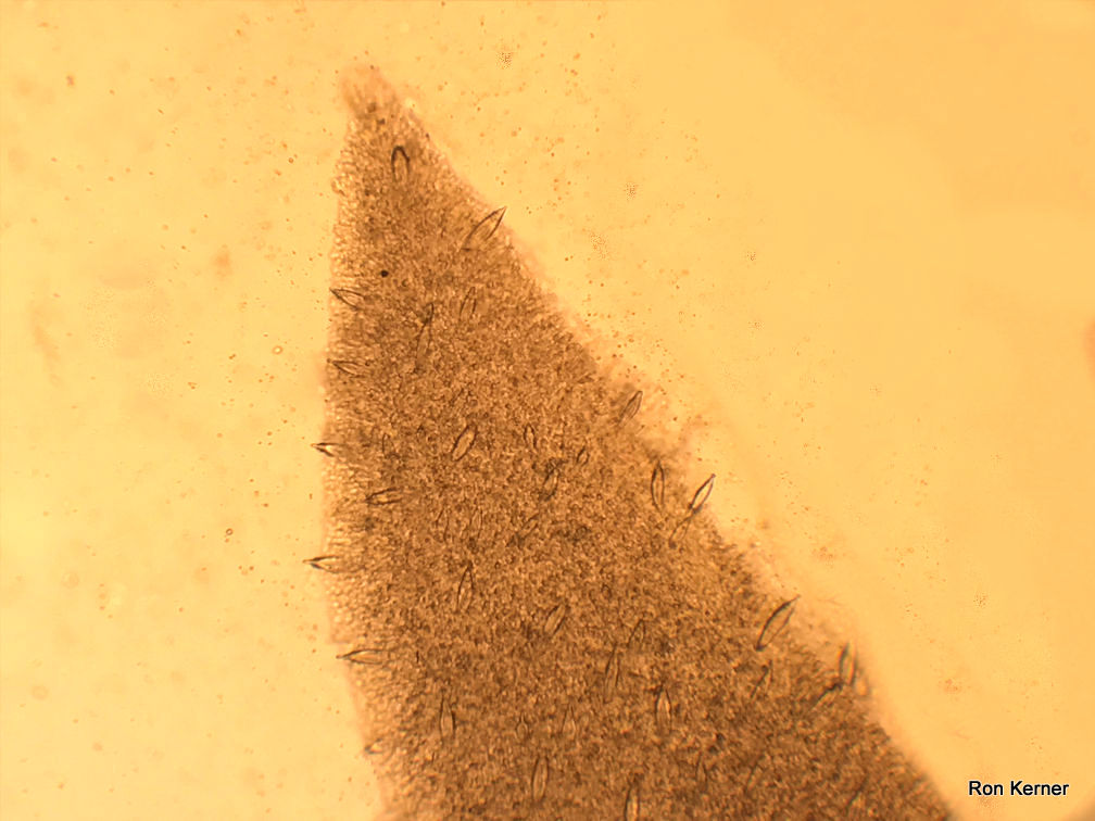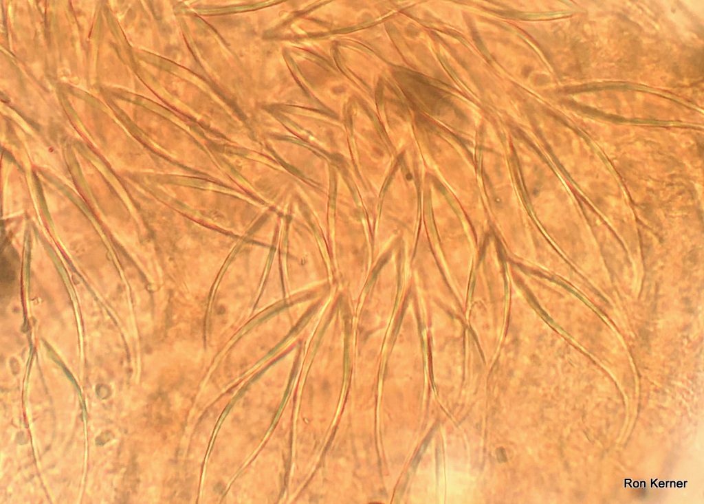 | Thick walled cystidia are abundant on the gills; lanceolate to fusoid, measuring 35–100 x 7.5–20 microns. |