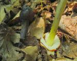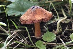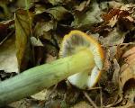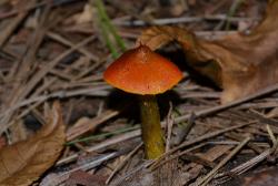| All parts of this waxy cap mushroom stain black and the entire mushroom turns black with age. Common name: Witch's Hat. |
