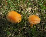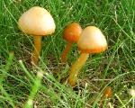 | The Parrot Mushroom. A large fruiting (200+) found in May growing from a lawn. Specimens exhibiting green cap coloration were immature and beneath the thatch layer, caps one centimeter or less; (mature caps up to 3.5cm). Caps change color as they develop and take on several different shades and shapes. Cap and stem very slimy (glutinous) throughout development. White spore print. |