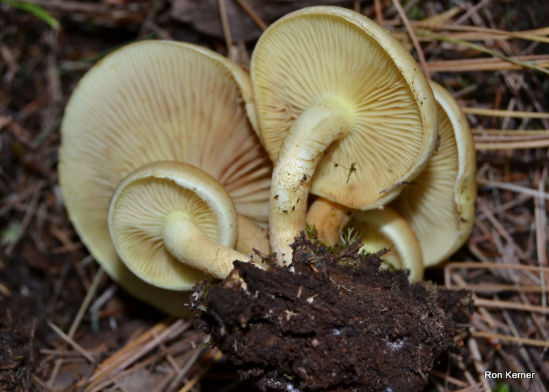 | Gills are white when young. Note partial veil remnants on cap margin. -The gills of Hypholoma fasciculare, a similar mushroom, are yellow/greenish and its cap yellow with age, unlike the orange-brown cap of Hypholoma capnoides. |