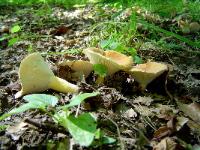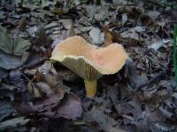 | Formerly Lactarius hygrophoroides. Found growing from ground in hardwood forest; summer. Lactifluus hygrophoroides features a brownish orange cap that yellows with age. Gills are widely spaced. Milk and spore print are white. |