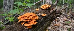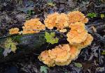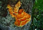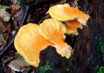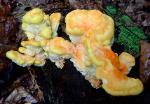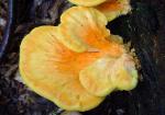 | Common names include Sulpher Shelf (because of color and growth habit) and Chicken Mushroom (because it taste like chicken). Sought out by many in the summer and fall. Pore surface yellow. Grows from wood. |