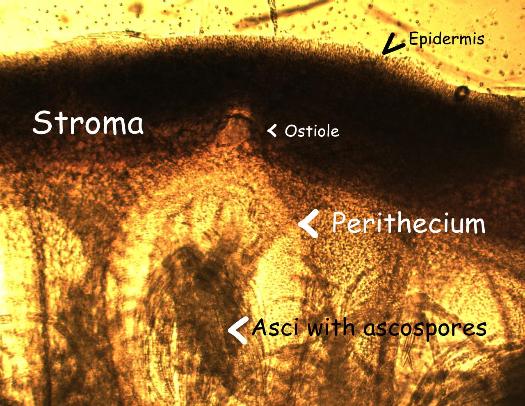 | Formerly placed in the genera Cordyceps and Elaphocordyceps, these fungi have been moved to the genus Tolypocladium (2014). Phylum Ascomycota. The two species presented here are myco-parasites of underground false truffles in the genus Elaphomyces. The club-like head of these mushrooms, called the stroma, is where spores are produced. Tiny pimples on the stroma represent little spore-producing factories called perithecia, immersed within the stroma. Known as sac fungi, spores (technically called ascospores) are made within microscopic sacs called asci. Ascospores are ejected from the perithecia into the atmosphere through small pores (ostioles). |