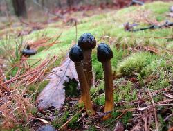 | These examples of Tolypocladium longisegmentum were very fresh (young) and the stoma and stem exhibited vibrant coloration. Growing from the underground fungus Elaphomyces granulatus. Without host, up to 5 cm long (2 in.) Compare to older and larger specimens pictured below. |