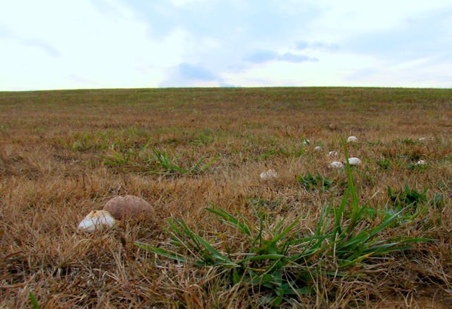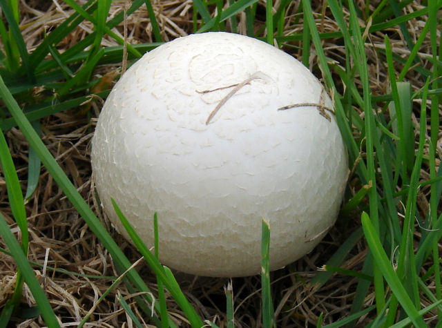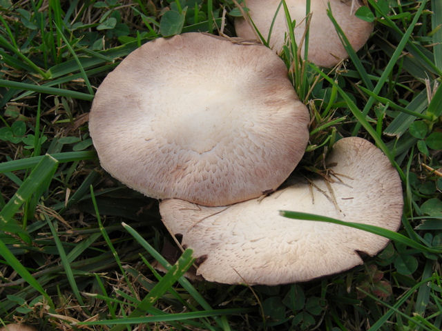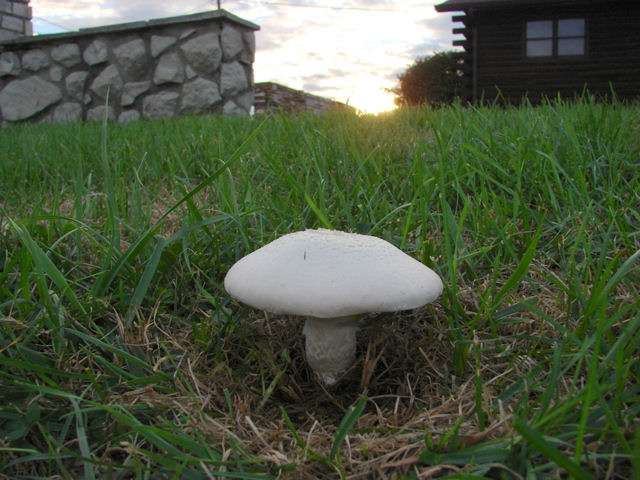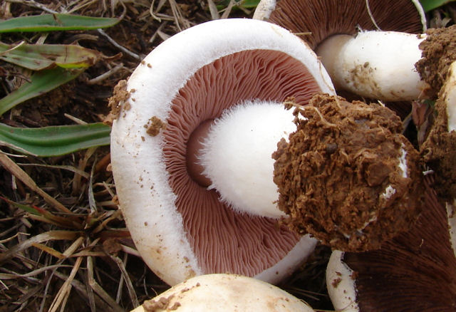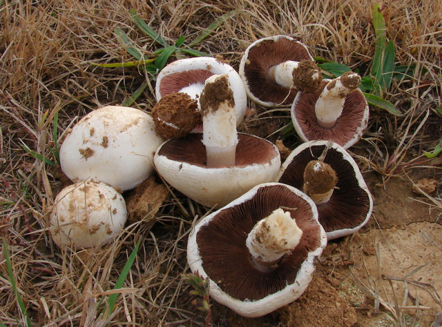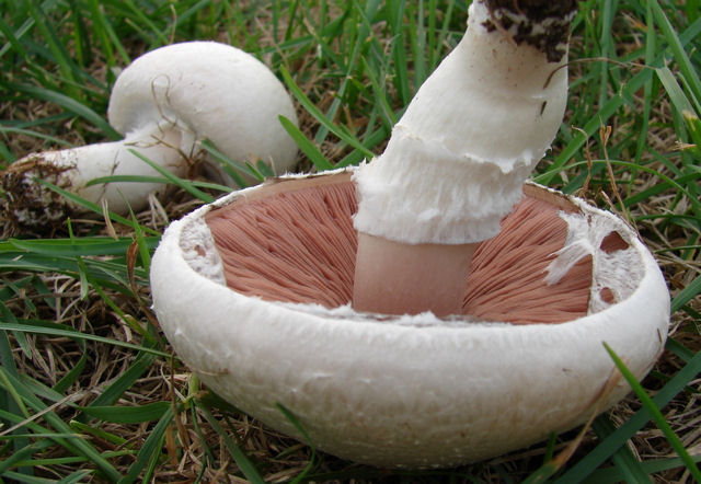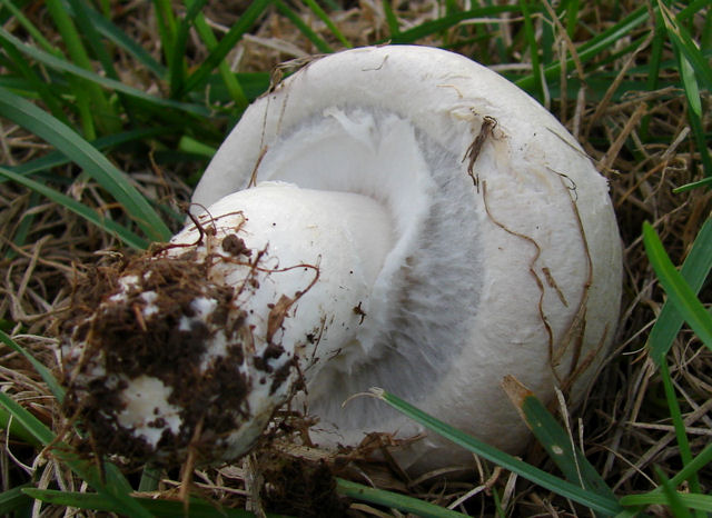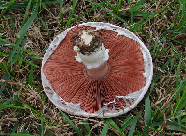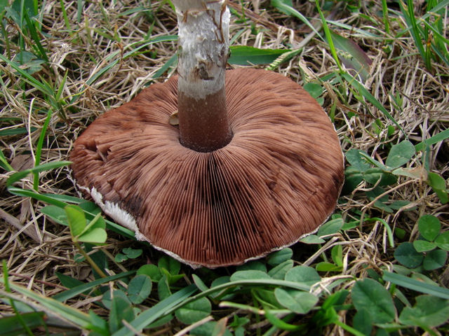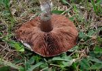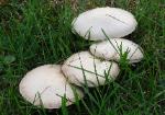 | Meadow mushroom. A choice edible. Found in the fall growing from lawns, open fields, school yards and meadows. Be sure the gills are pink (when young) or chocolate brown (when mature). According to Steve Russell of MycoMap.Com, "All specimens of Agaricus "campestris" we have are A. argenteus or A. andrewii. Easily separated based on spore size. A. argenteus larger than 8 micron. A. andrewii shorter than 8 micron." |