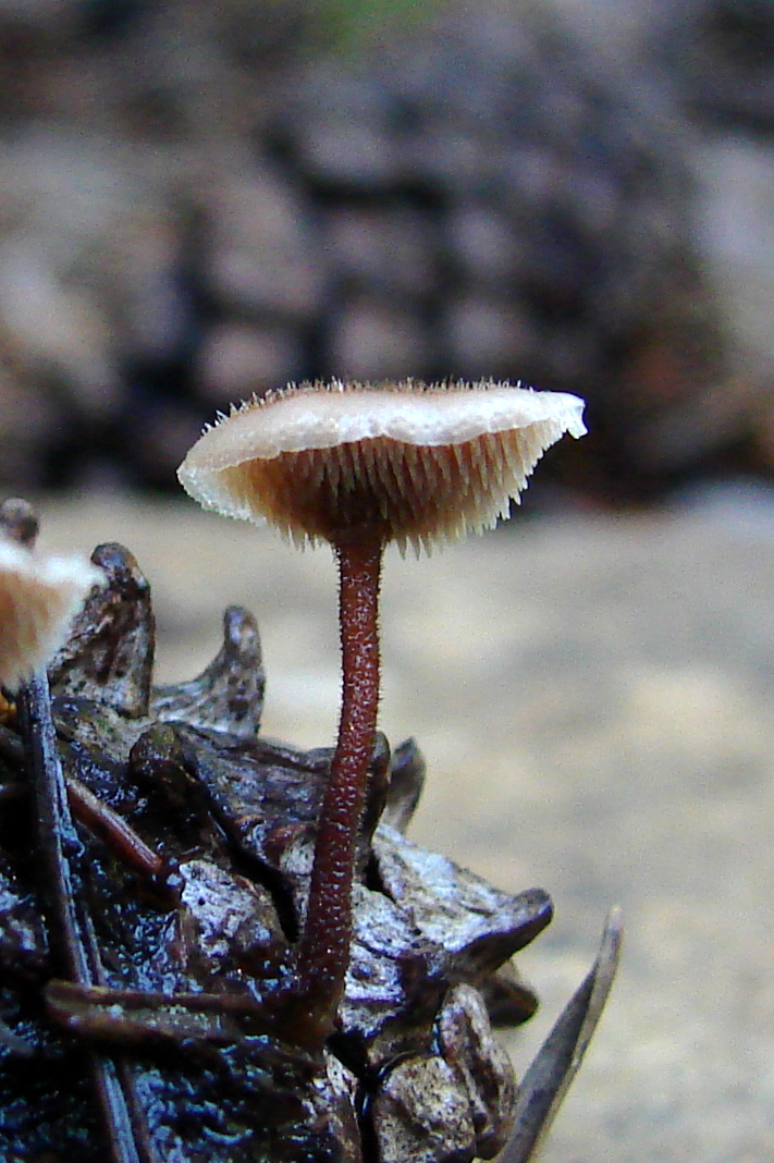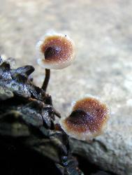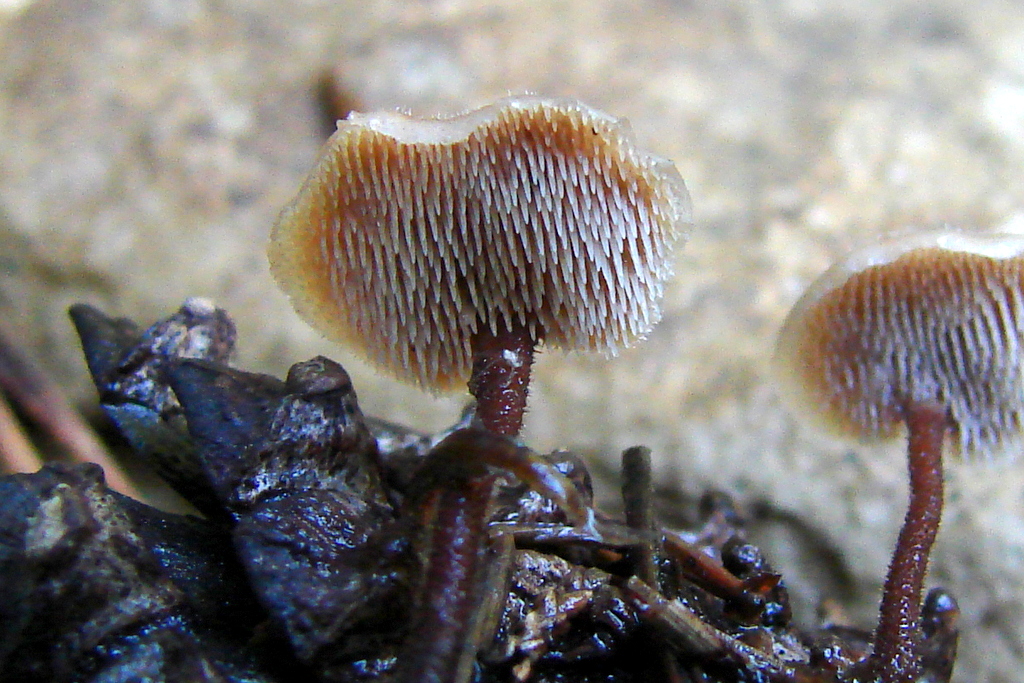 | Michael Kuo of MushroomExpert.Com calls this little mushroom "goofy", and it is. But it is also cute as a button and about the same size. Although said to be common, you really have to look for it specifically. Just check out every pine cone lying on the ground and, sooner or later, you'll be rewarded with this goofy little toothed mushroom. Took me ten years of pine cones. This collection was found in August growing from a pine cone; also found on the cones of Douglas fir. Cap and stem have a tough consistency and are finely hairy. Teeth are white, brown with age. Stem is laterally placed, not centered. Spore print white. |