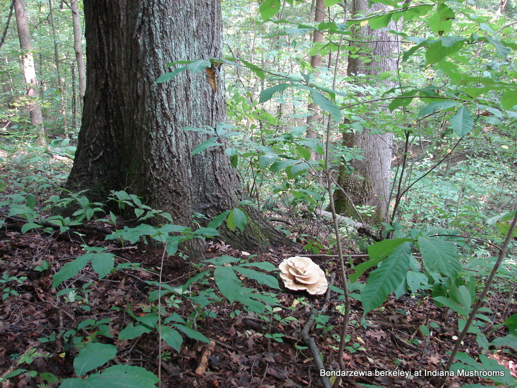 | This example of Berkeley's polypore fruited in early September; McCormick's Creek State Park, Owen county. Growing at the base of a very large oak tree (10 foot girth; probably over 100 years old). This fungus is a tree pathogen and likes to eat tree roots and wood at the base of living trees. |