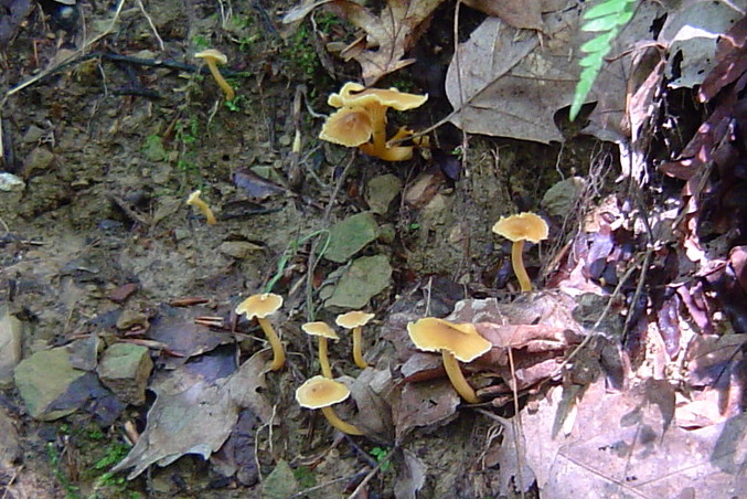 | Found in summer in oak/beech woods. Yellowish-brown cap and stem, with a darker center on cap with age. Small mushroom, couple inches wide and three or four inches tall. Very pleasant apricot smell. A good edible if you can find enough. |