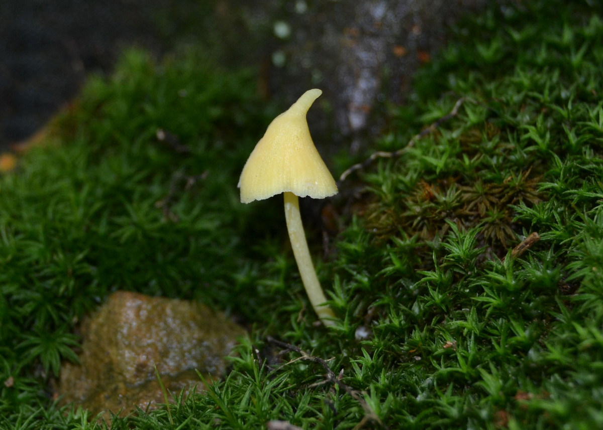 | The quirky Entoloma murrayi has a yellow cap, yellow stem and yellow gills. Its pointy cap gives rise to the common name yellow unicorn mushroom. |