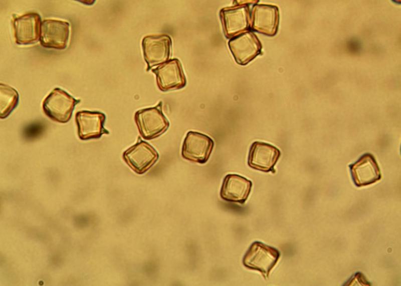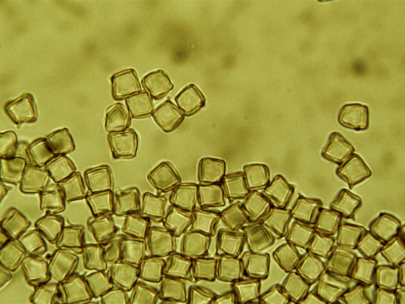 | Cube-shaped spores (6-10µ) appear square under the microscope. |