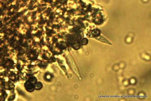 | The cystidia of Lactarius oculatus have tapered, pointed and constricted ends. |