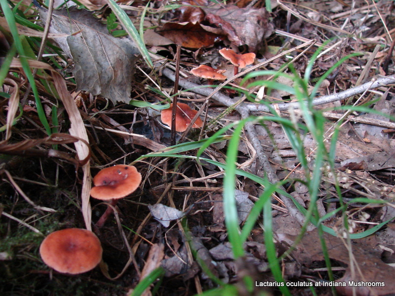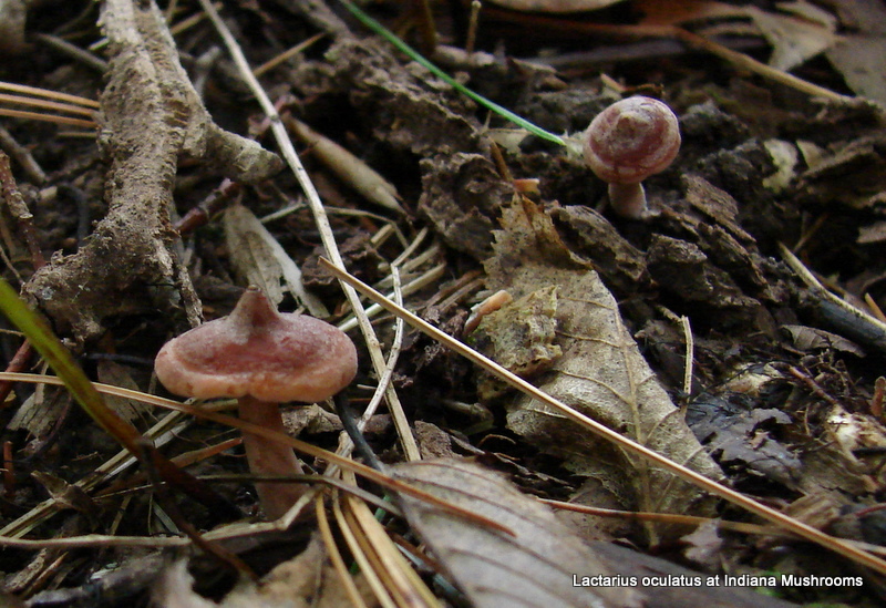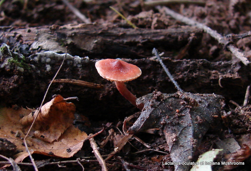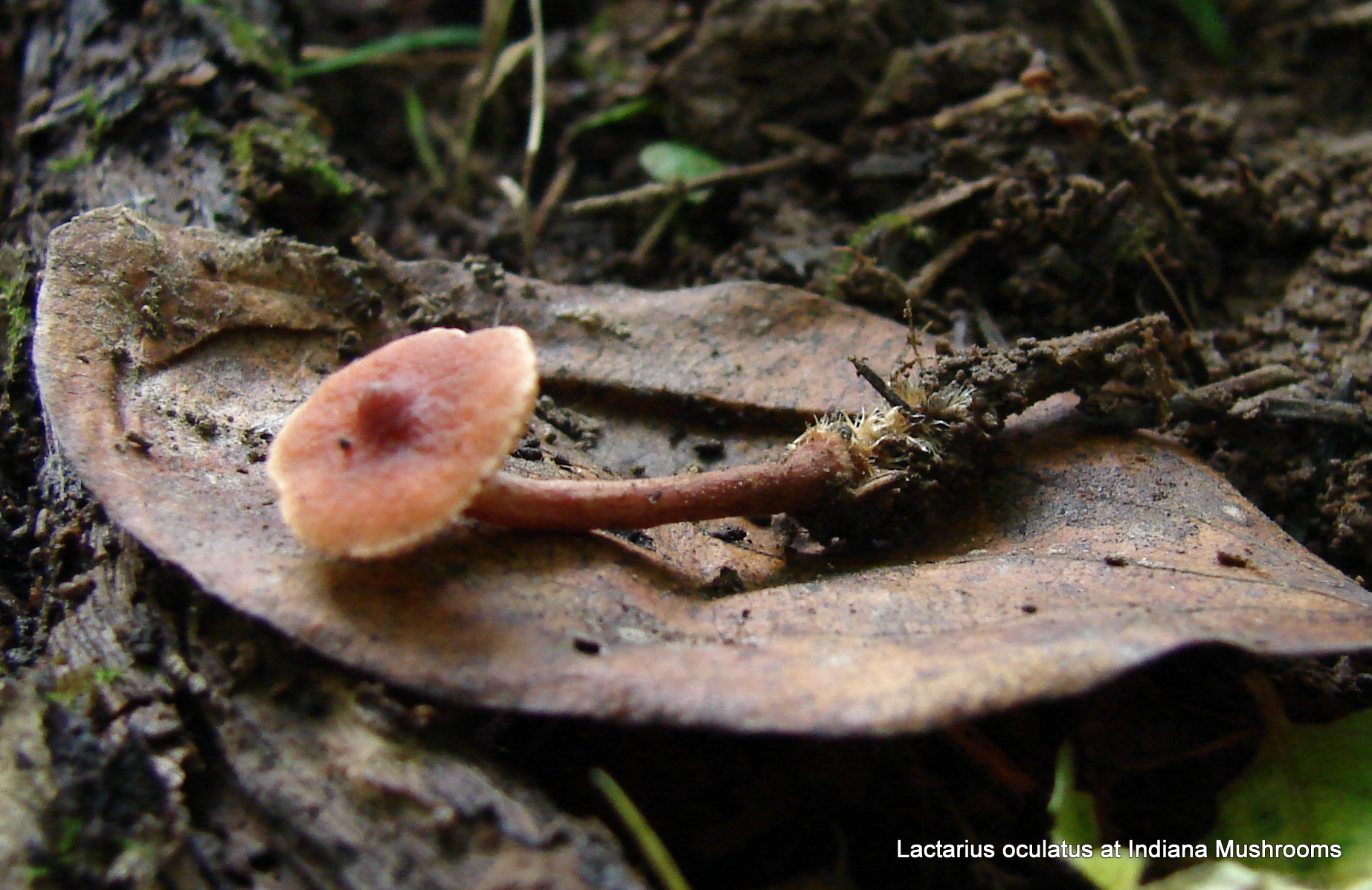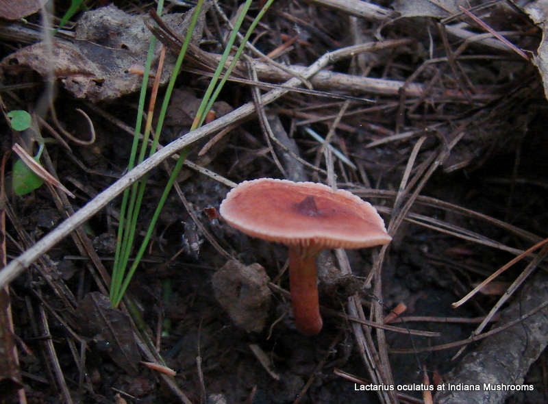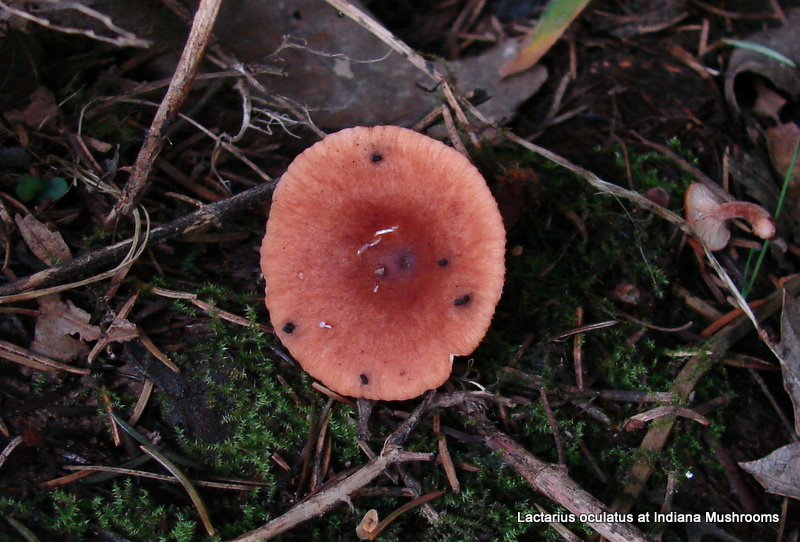 | The Eye Spot Milky. Found late summer, early fall. This milk cap mushroom has several features that are not always apparent: the lined cap margin, zonate cap when young and absence of papilla (nipple) when cap becomes depressed, or sunken. |