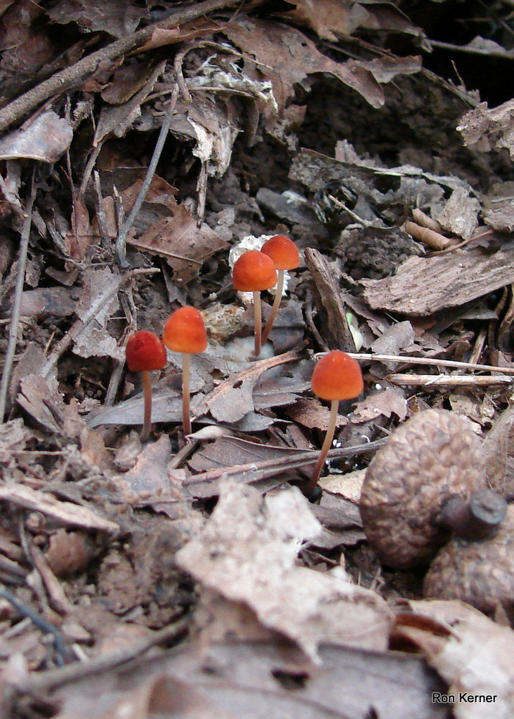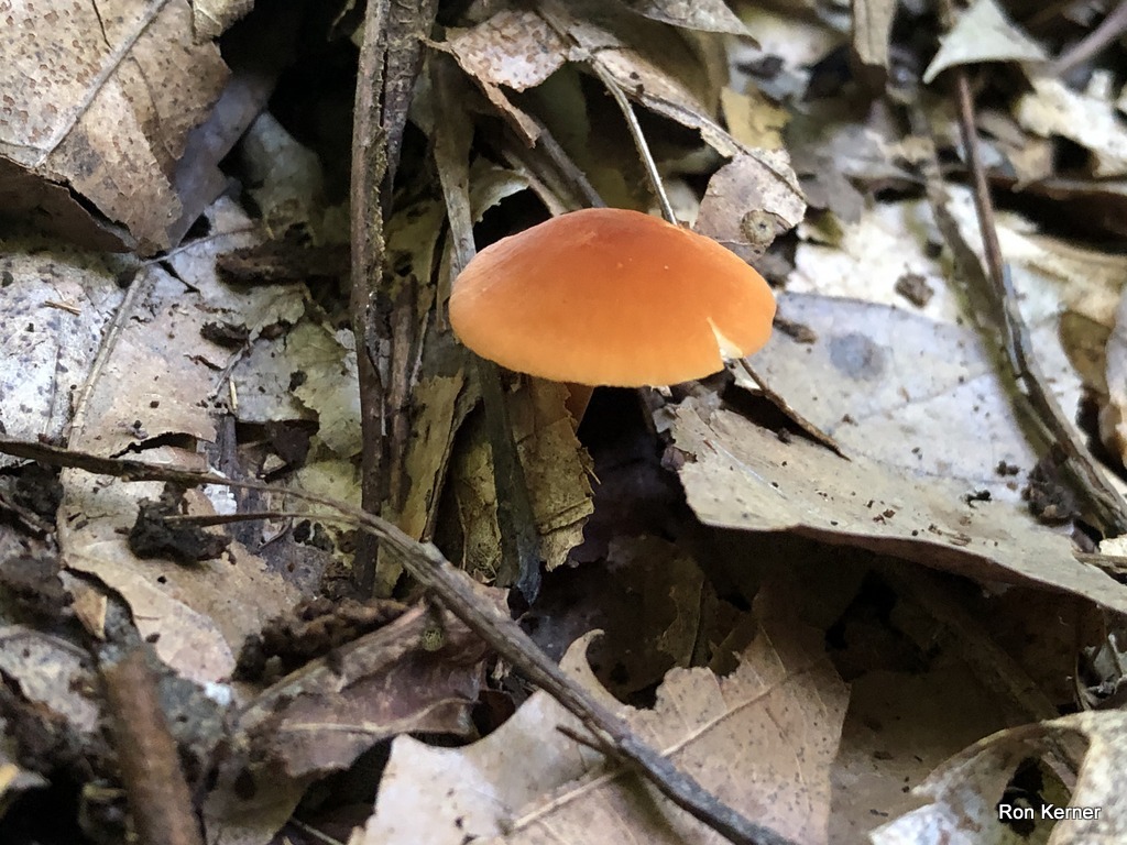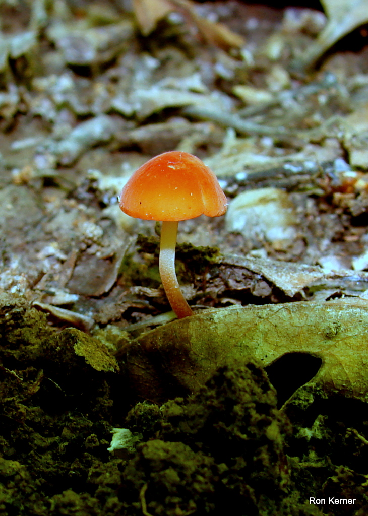 | This gorgeous mushroom is rather common in the hardwood forests of Indiana, fruiting in the summer and into fall. Cap color a glowing orange-red when young, fading to an auburn brown. The stem is tri-colored. Spore print white. Marasmius sullivantii is a decomposer of forest floor debris; what we see as dead leaves and twigs this fungus sees as dinner. |