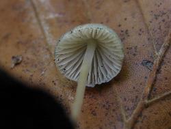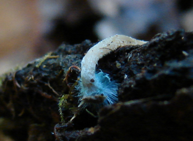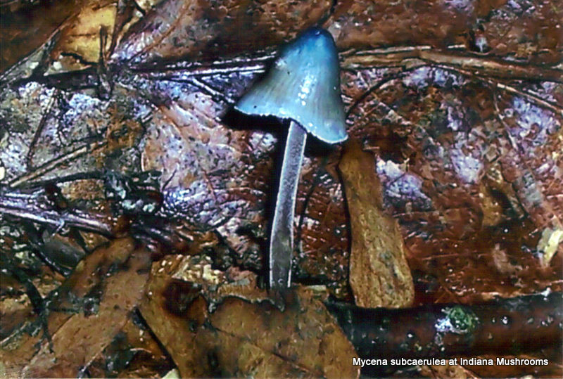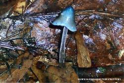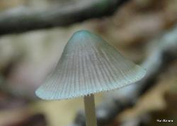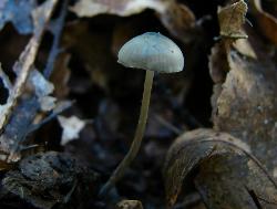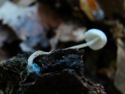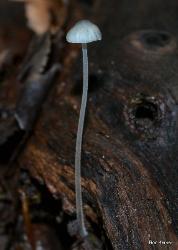 | Grows from well rotted wood and woody debris. Blue coloration at cap apex and margin often apparent, although sometimes overall tan. A small, fragile mushroom. |