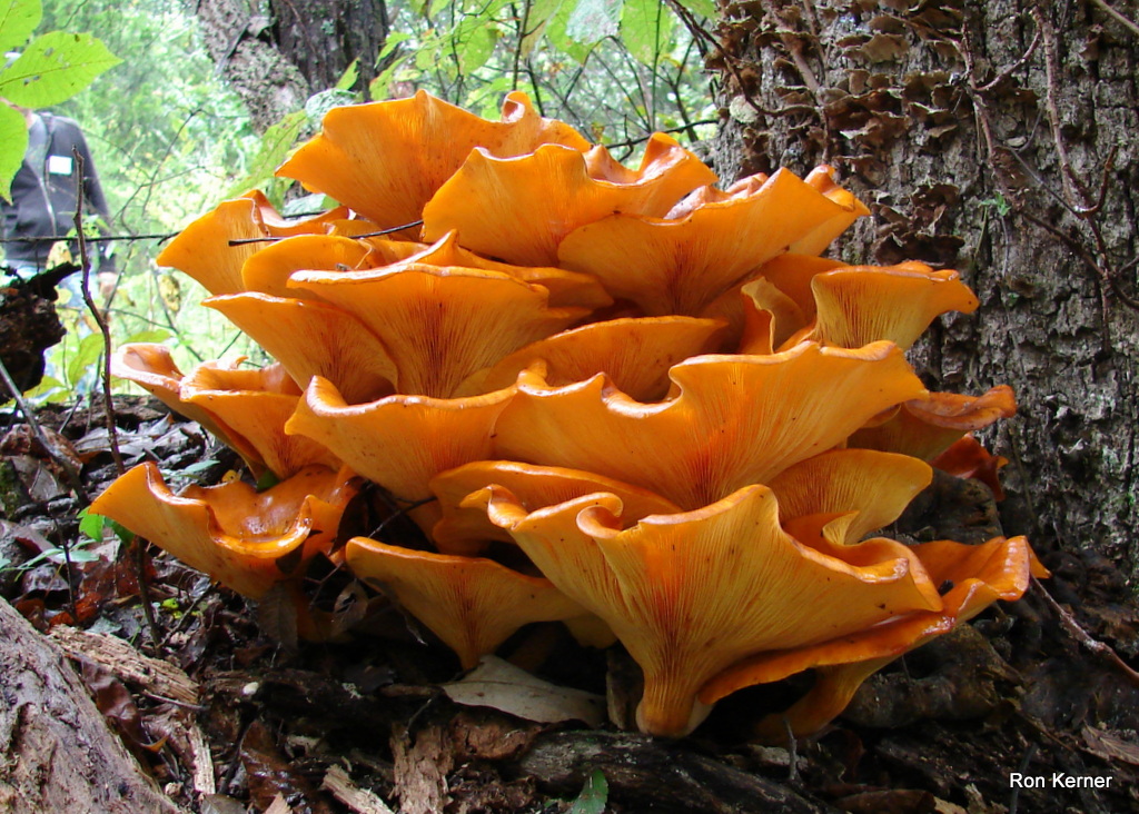 | The Jack O'Lantern mushroom. Summer/Fall. Grows in clusters from wood. Orange overall. Gills run down the stem. Base of stem tapered. Spore print white to creamy yellow. Poisonous. Gills have bioluminescent properties - they glow in the dark. |