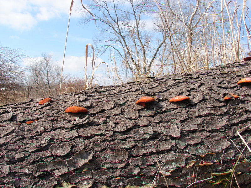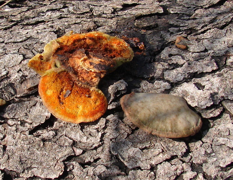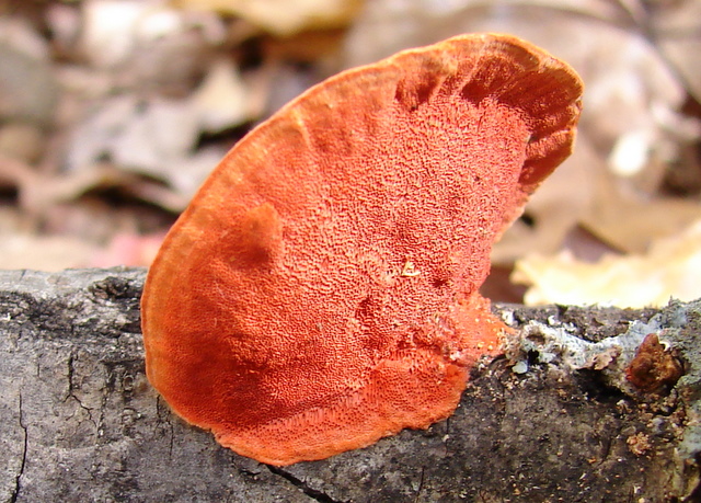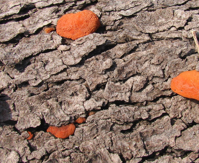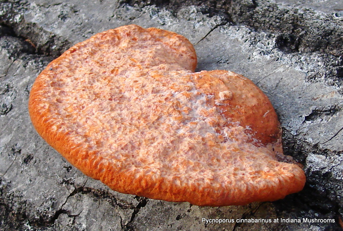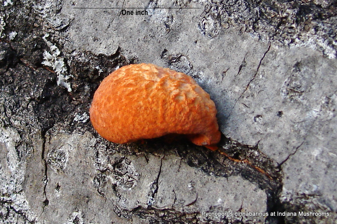 | Formerly Pycnoporus cinnabarinus. These examples were found growing from a cherry log. Dingy orange upper surface; pore surface saffron red. Largest shown 3.5 inches (9cm) across. Monroe county, Clear Creek Trail; March. |